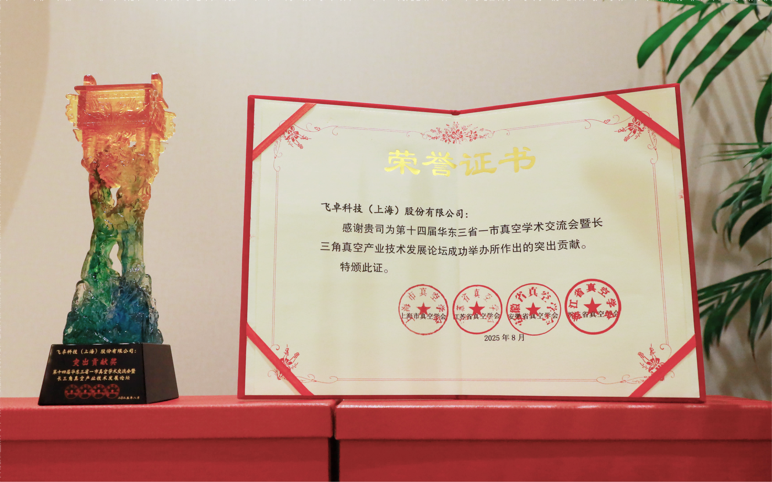 捷报频传!在本次论坛的重要环节,飞卓科技凭借在真空技术研发、产业推动及区域交流合作方面的卓越贡献,被大会组委会授予 “第十四届华东三省一市真空学术交流会暨长三角真空产业技术发展论坛 突出贡献奖”!